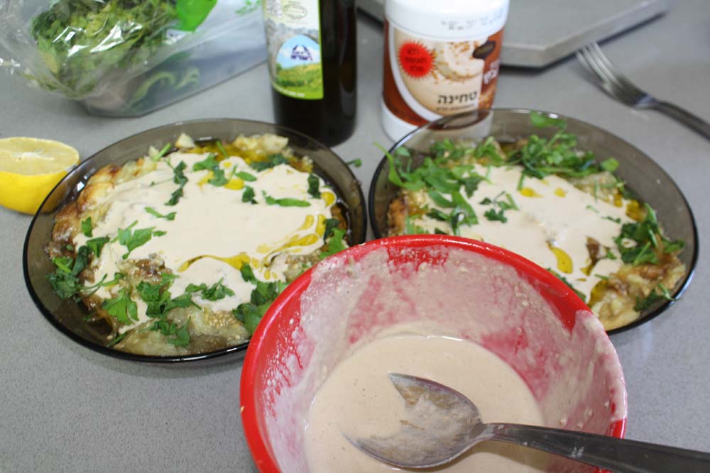 שופכים על החציל את הטחינה המדוללת