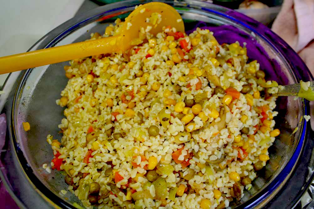 שופכים את כל הירקות על גבי הבורגול המסונן ומערבבים היטב