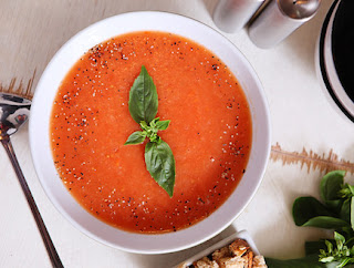מרסקים את העגבניות בבלנדר למחית חלקה וחותכים את שאר הירקות לקוביות קטנות